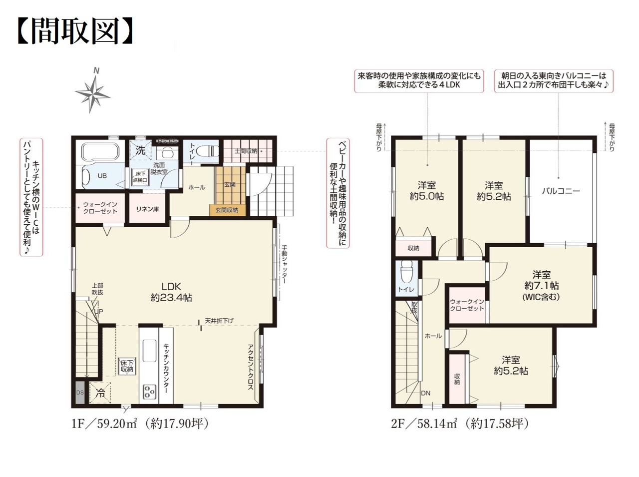 | 間取 | 4LDK (LDK23.4帖、洋室7.1帖、洋室5.2帖、洋室5.2帖、洋室5.0帖) | ||