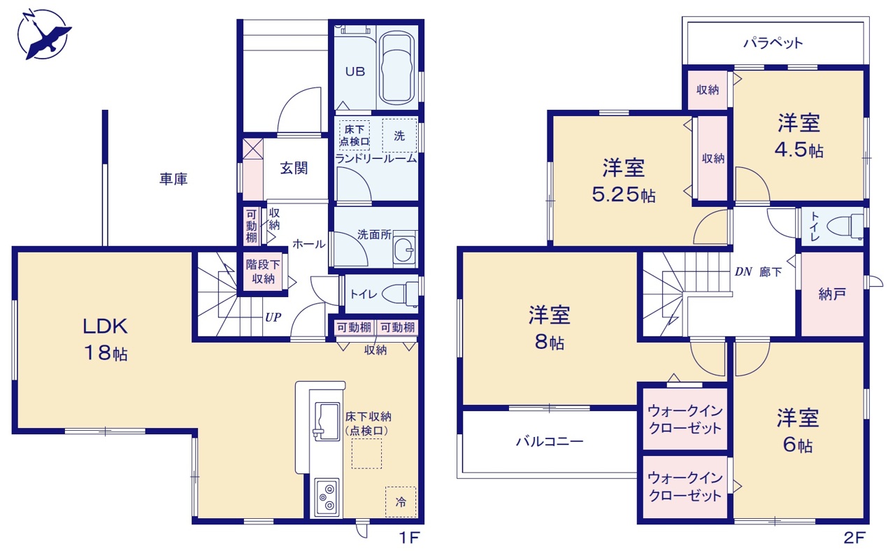 | 間取 | 4SLDK (LDK18帖、洋室8帖、洋室6帖、洋室5.25帖、洋室4.5帖) | ||