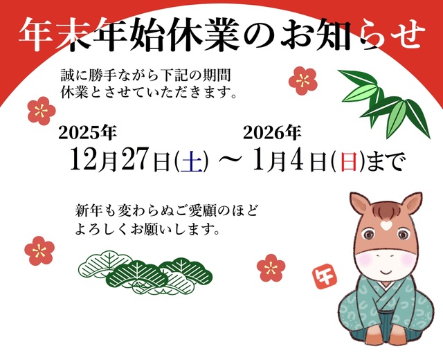 ※冬期休暇中にいただきましたお問い合わせにつきましては、2026年1月5日(月)以降ご回答をさせていただきます。